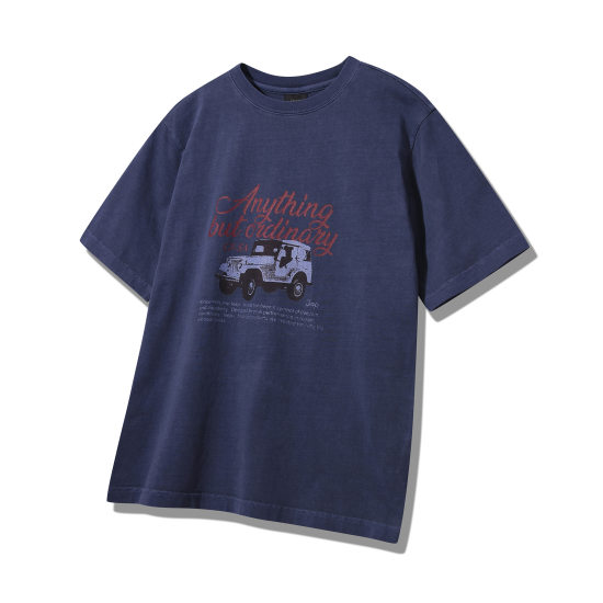 -네이비 칼라의 빈티지한 가먼트 다잉 기법을 사용-지프 레터링과 지프차 그래픽으로 프린트함