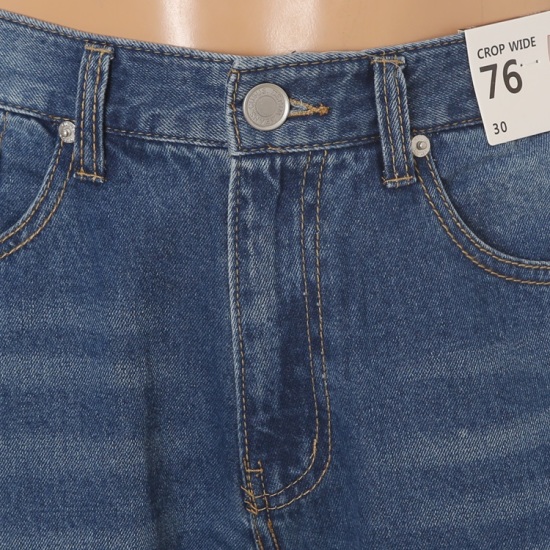 10부 길이의 크롭 와이드 청바지이며 길이는 롤없해서 착용 가능하며 편하고 무난하며 착용자의 움직임에 따라 활동성이 좋은 스타일의 크롭 와이드 청바지