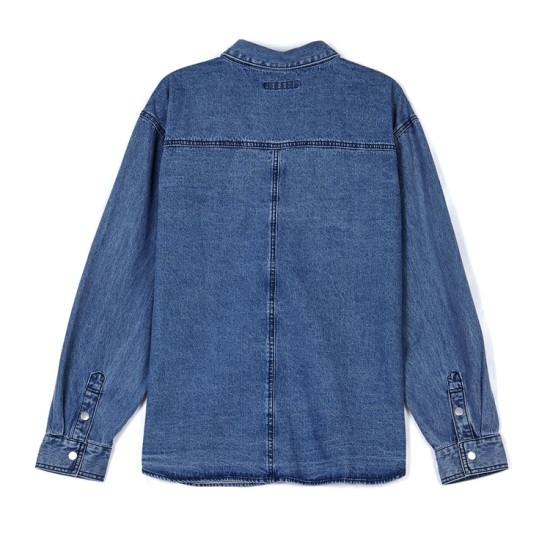 2025년 가을 신상품이며 오버핏 스타일의 데님 긴팔 남방이여 앞 가슴 부분에 포켓으로 포인트를 주었으며 때로는 오픈해서 셔켓 남방