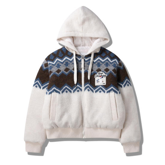 -겨울 느낌이 나는 노스텔직 자가드 패턴으로 칼라 블러킹을 주었고 수술 장식이 있어 귀여운 느낌을 줍니다.
