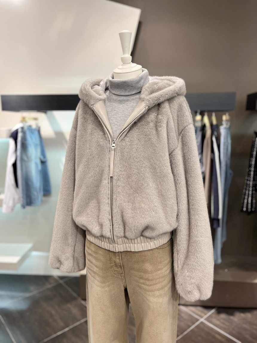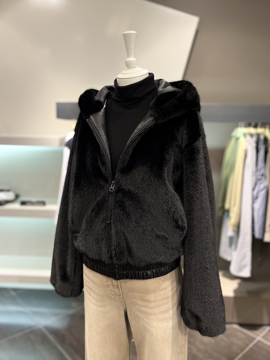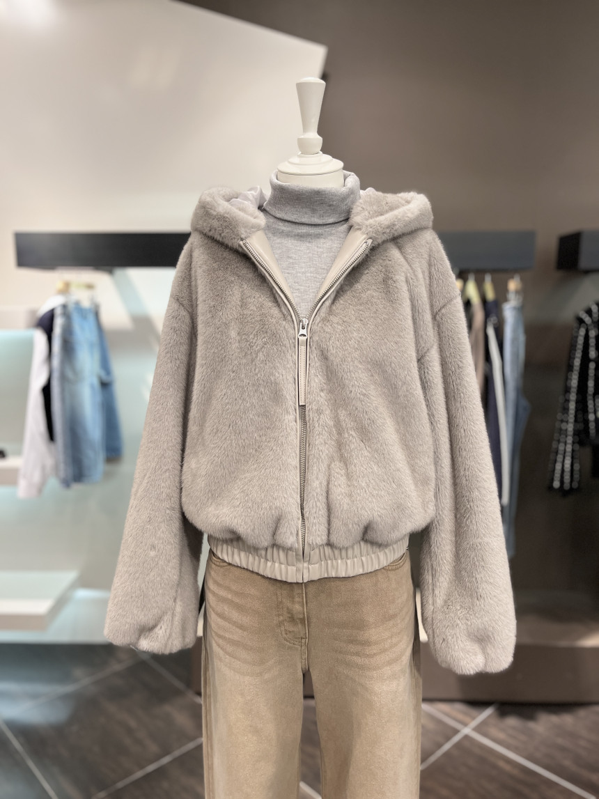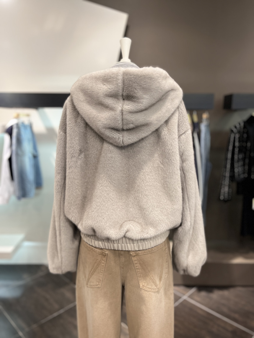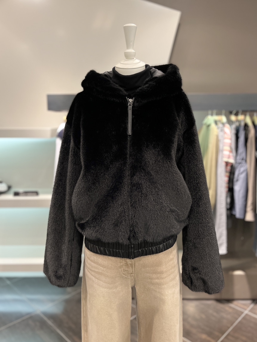 부드러운 텍스처의 신세틱 퍼로 제작된 블루종 후드 점퍼입니다.