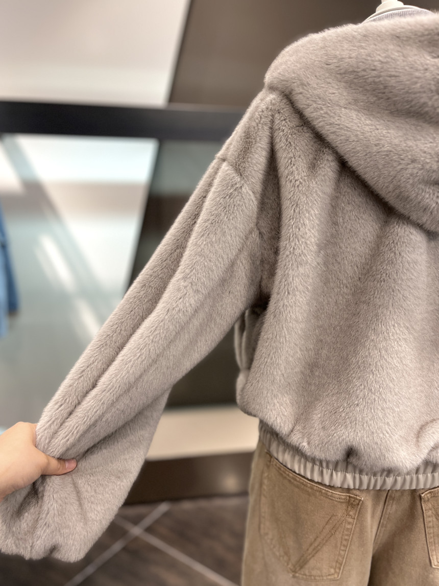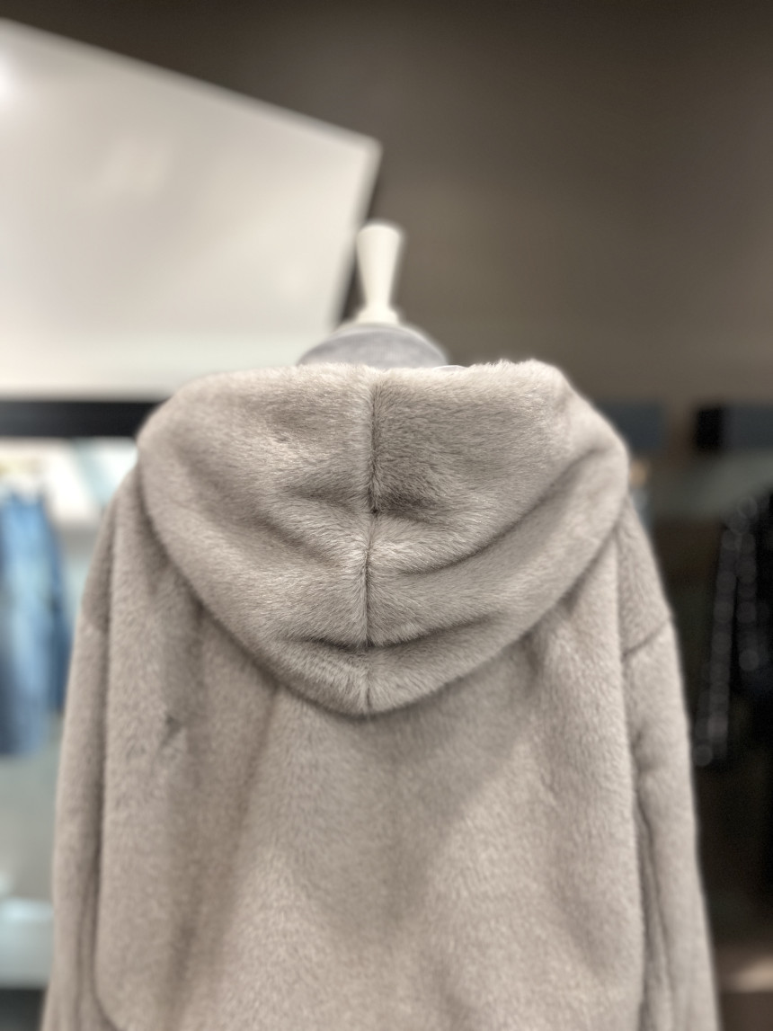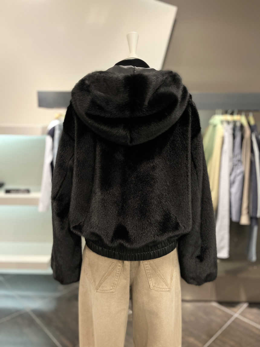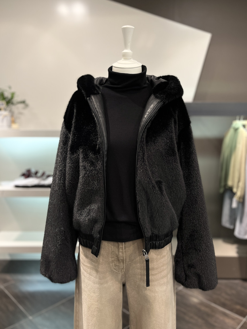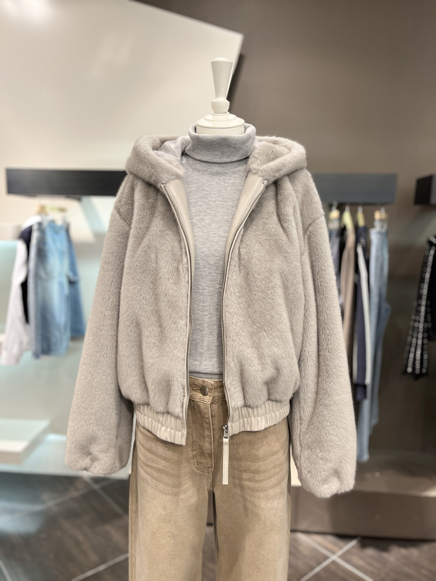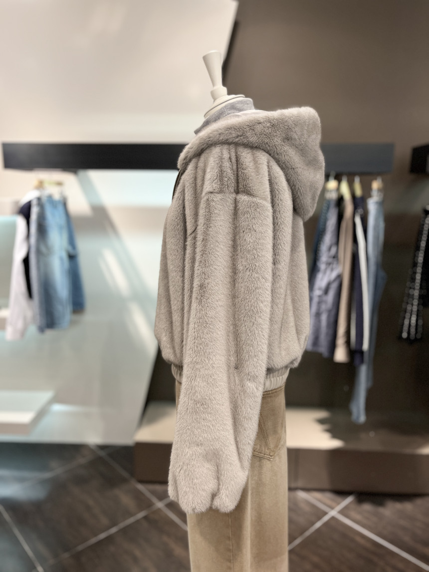 부드러운 텍스처의 신세틱 퍼로 제작된 블루종 후드 점퍼입니다.
