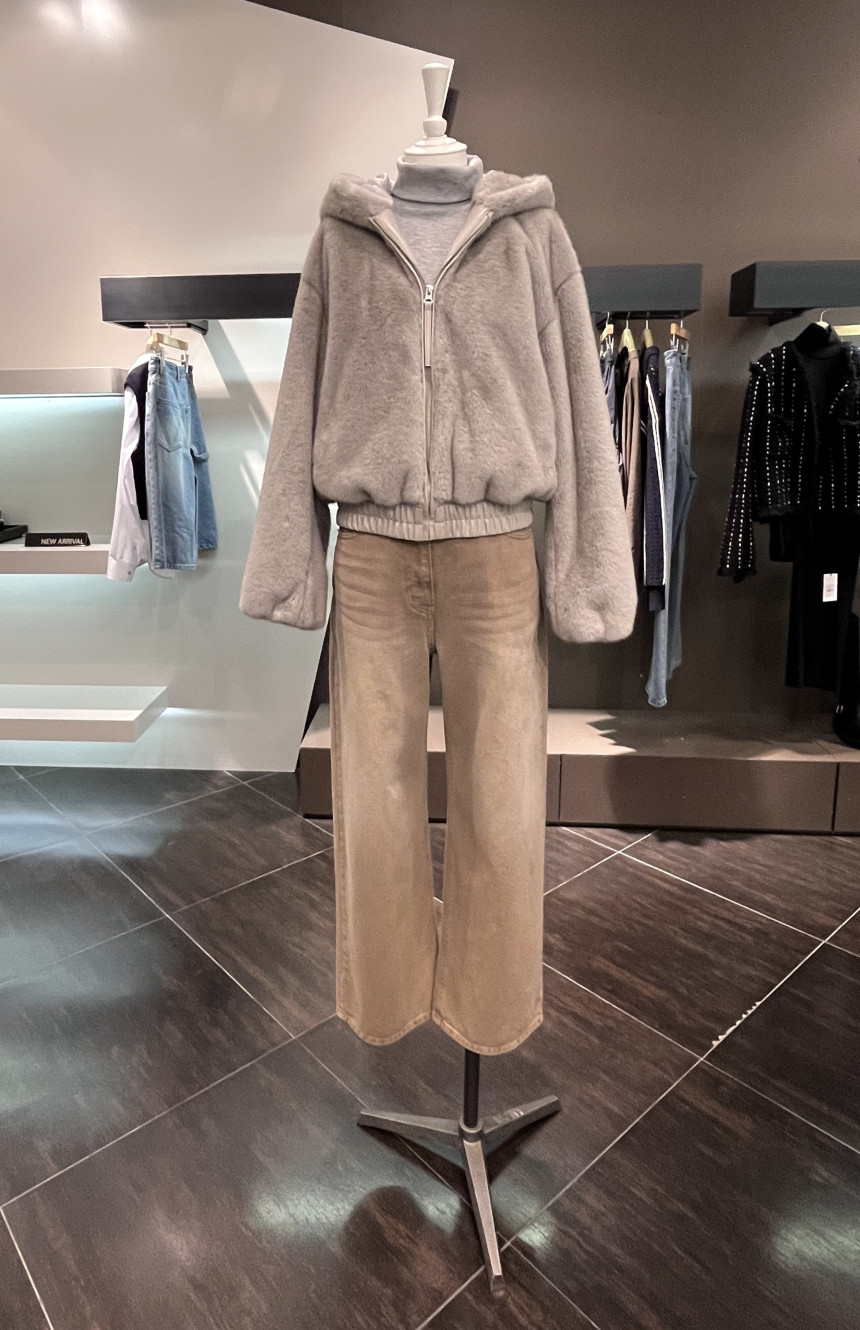 후드와 밑단 시보리가 트렌디한 블루종 디테일을 보여주며,