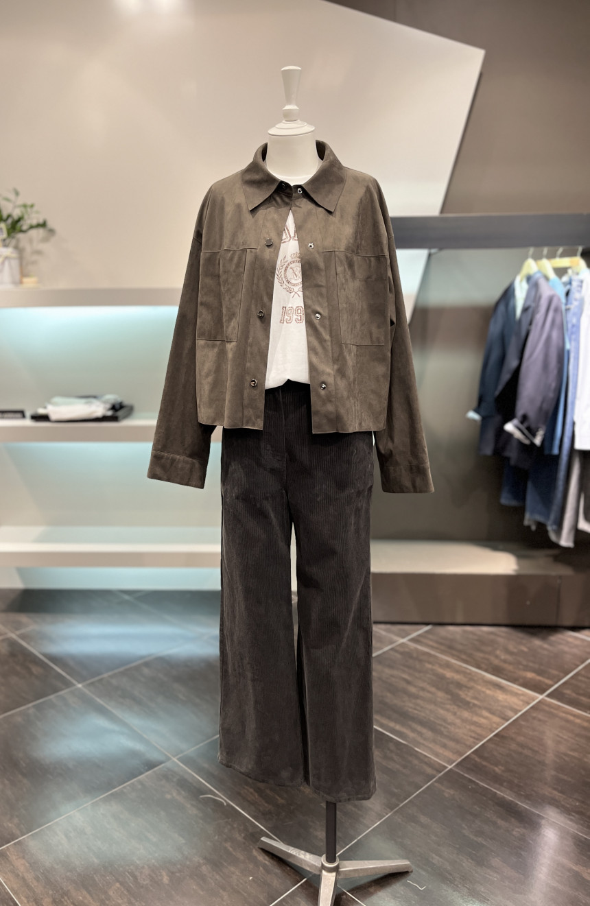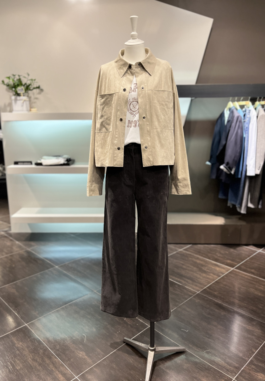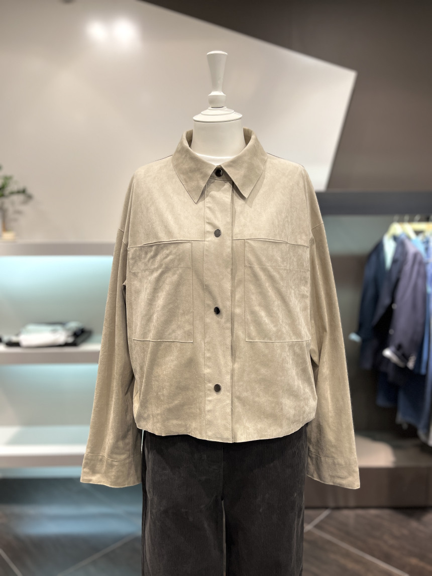 길지 않은 크롭한 기장에 여유로운 품의 셔츠형태의 자켓으로 편안하게 착용이 가능합니다.
