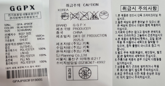 | 소재 | 겉감 : 폴리에스터100% 안감 : 폴리에스터100% 충전재 : 폴리에스터100% |