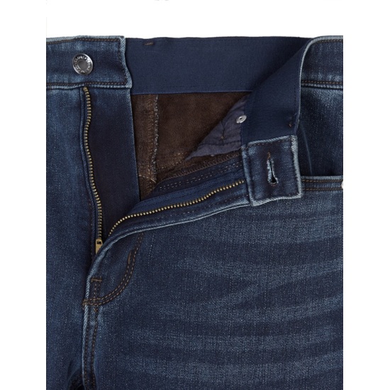청바지이며 편하고 무난하며 코디가 다양하게 잘 어울리는 스타일의 스판 청바지이며 데님 원단 안쪽에 기모 가공을 더하여 포근한 터치감과