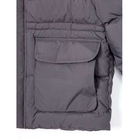 2025년 겨울 신상품이며 후드 탈부착이 가능한 스타일의 야상 사파리 덕다운 점퍼이며 무봉제 기술를 적용한 튜브 원단을 사용하여