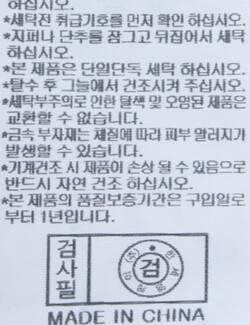 | - | 되도록 드라이 크리닝 하십시오. (데님, 언더웨어 상품은 물세탁시 중성세제를 사용, 표백성분 세제 사용금지), 손세탁시 뒤집어 세탁 하십시오. (데님 상품은 연한 색상과 함께 세탁할 경우 이염 될수 있음), 세탁시 탈색 될수 있으며 착장시 가방류나 밝은 색상의 의류에 이염 될 수 있으니 주의 하십시오. |