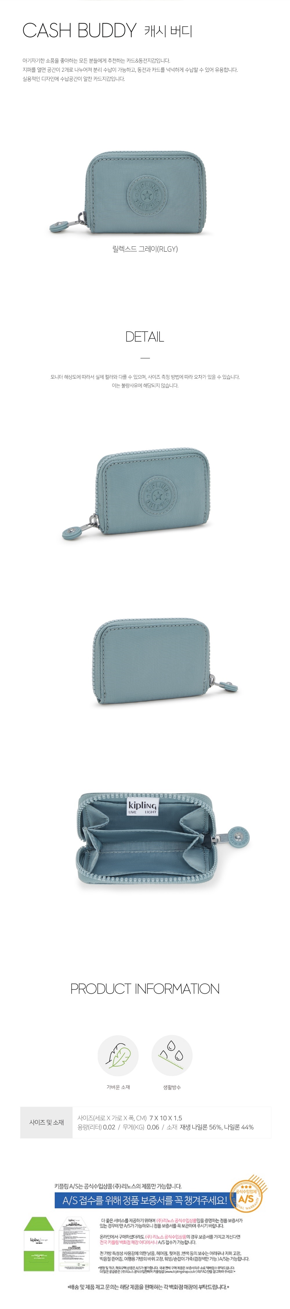 (롯데백화점)키플링 카드지갑 동전지갑 캐시버디 릴렉스드 그레이 KPABL01 RLGY