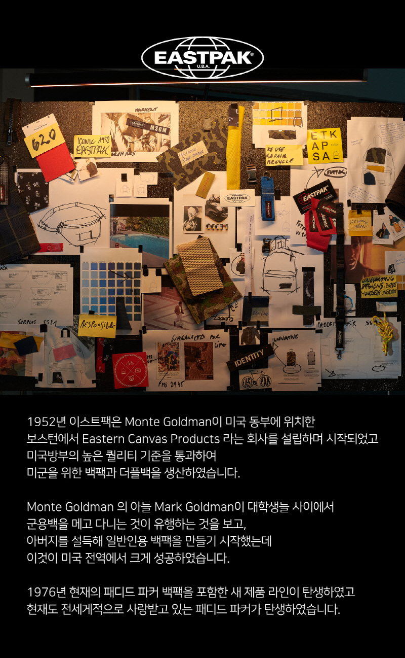 1960년에 몬테 골드먼(Monte Goldman)이 이스턴 캔버스 프로덕츠(Eastern Canvas Products)란 회사를 설립하고 미군을 위한 배낭을 생산했다. 그 후 1976년에 학생들이 군용배낭에 책을 넣어가지고 다니는 것을 본 몬테의 아들 마크(Mark)가 그의 아버지를 설득하여 일반인들을 위한 백팩을 만들어서 판매하기 시작했는데 이것이 대학생들에게 선풍적인 인기를 끌었다. 1979년에 가방에 '이스트팩'이란 브랜드명을 붙였다.