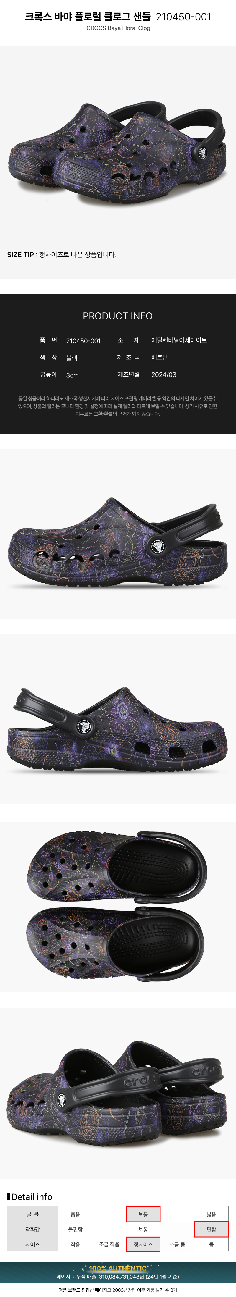 2024 FW 크록스 바야 플로럴 클로그 여성 슬리퍼 샌들 블랙 210450-001
