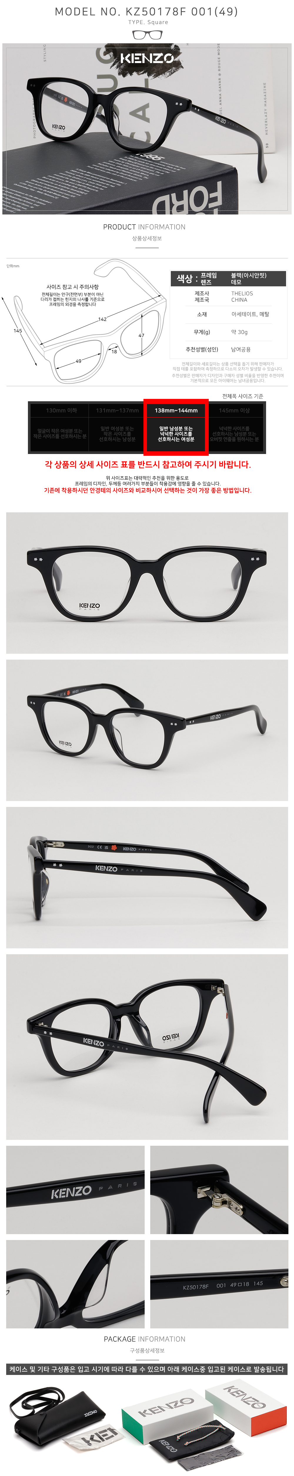 하프클럽/겐조 안경테 KZ50178F 001 블랙 아시안핏 사각 뿔테 명품 데