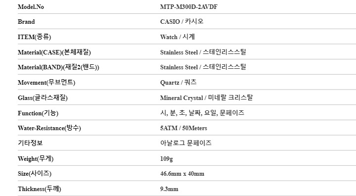 카시오 CASIO MTP-M300D-2AVDF 남성 시계