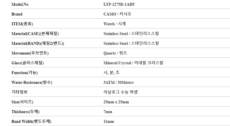 카시오 CASIO LTP-1275D-1ADF 여성 시계