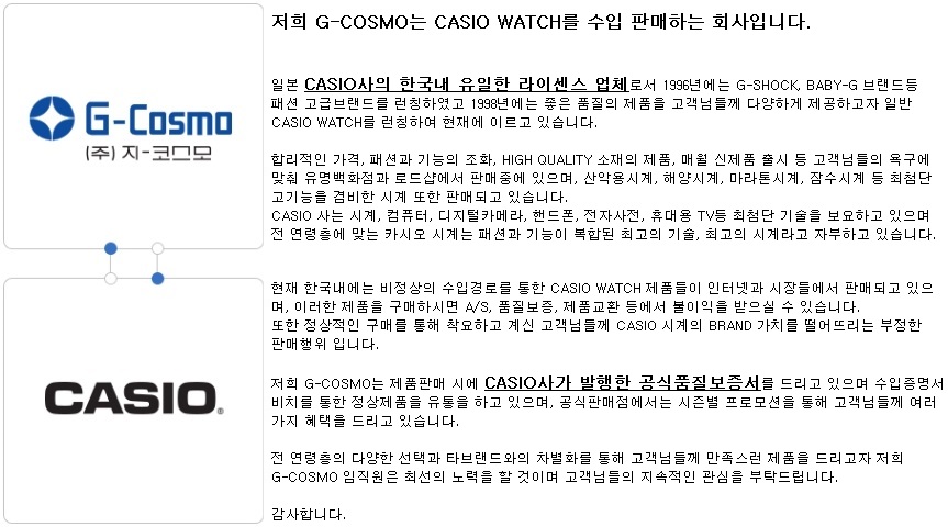 저희 G-COSMO는 CASIO WATCH를 수입 판매하는 회사입니다.일본 CASIO사의 한국내에서 유일한한 라이센스 업체로서 1996년에는 G-SHOCK, BABY-G 브랜드등 패션 고급브랜드를 런칭하였고 1998년에는 좋은 품질의 제품을 고객님들께 다양하게 제공하고자 일반 CASIO WATCH를 런칭하여 현재에 이르고 있습니다.