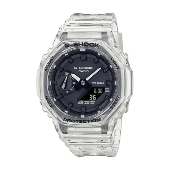 강건함을 추구하고 진화를 거듭하는 G-SHOCK에서 투명 레진 소재로 구성된 스켈레톤 시리즈의 GA-2100SKE-7ADR을 소개합니다.