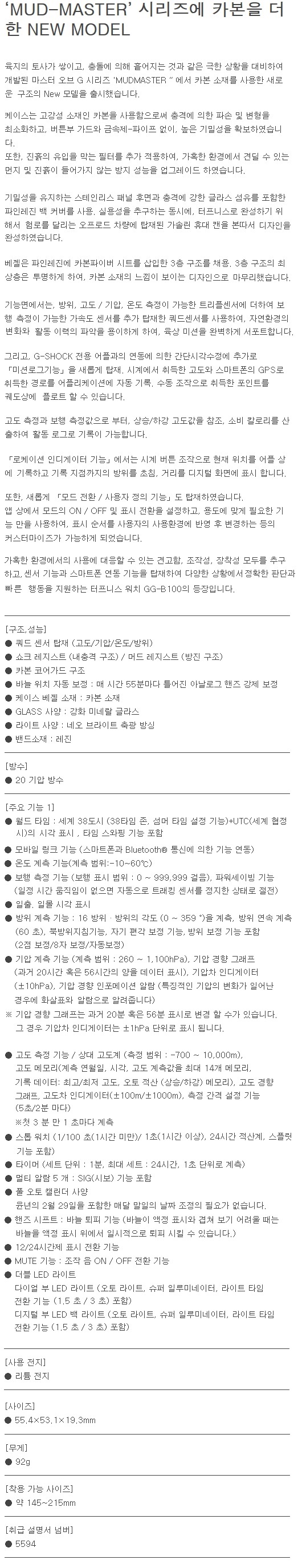 (롯데백화점)GG-B100-1A9DR JJSSR 카본 코어 가드 구조 머드마스터 블루투스 연동 전자시계
