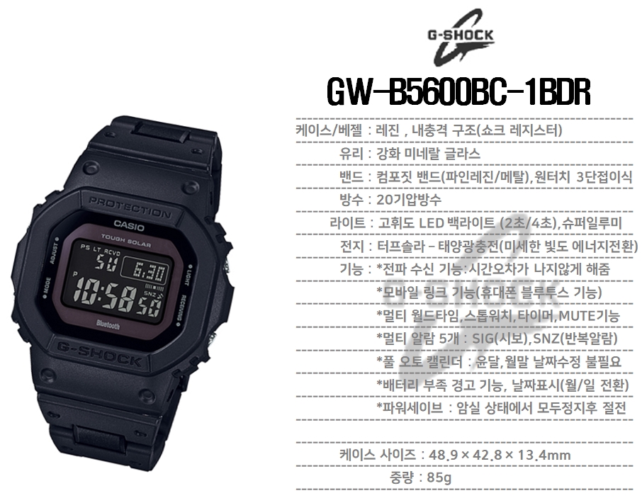 (롯데백화점)GW-B5600BC-1BDR 스퀘어 터프솔라 전파수신 블루투스 방수시계 CW