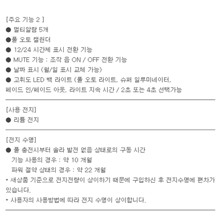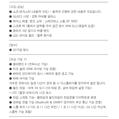 지속적으로 비눗물이나 샴푸물이 계속 닿으면 습기차는 현상이 발생할수 있습니다.밝은 색상의 경우 때가 타거나, 색상이 변색, 이염될 수 있습니다.물속에서는 버튼누름을 삼가해주세요.충격을 크게 받으면 밴드에 기스가 날 수 있습니다.(에나멜코팅,무광코팅)