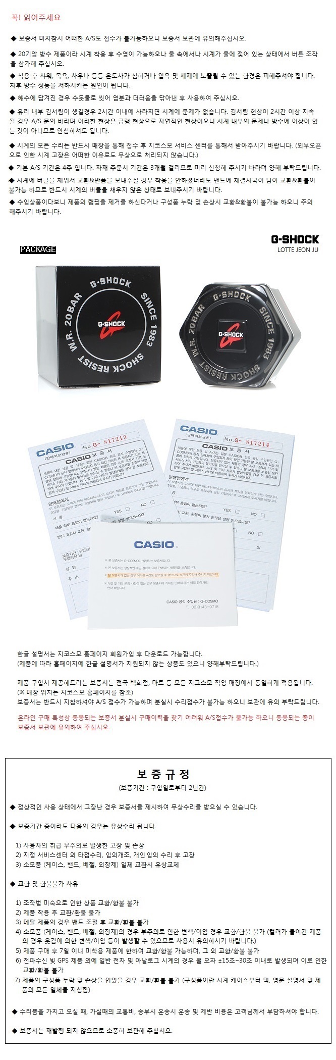 시계 자체적인 문제로 2년 이내 문제가 생겼을 경우에는 무상으로 수리가 가능오나 고객님의 임의적인 분해, 공식 센터가 아닌 다른 곳에서의 수리에 의한 고장으로는 기간에 상관없이 무조건 유상으로 처리가 되며, 시계 소모품에 관해서는 보증기간에 상관없이 모두 '유상'으로 처리됩니다.기본적인 수리 기간은 한달 걸리며, 소모품 및 자재에 관해서는 3개월정도 기간이 걸리므로 미리 주문을 넣어주시기 바랍니다.2016. 8. 1일 부터는 백화점 내 G-SHOCK 매장 구매 전상품 대상의 보증기간이 2년으로 보증 됩니다.