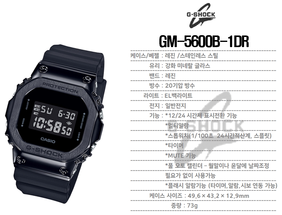 케이스 내부에 레진 소재, 베젤 커버 부분에는 경질의 스테인리스를 사용하여 가볍고 편안한 착용감을 유지하면서도 높은 질감을 이끌어 냈습니다. 또한 반전 액정을 적용하여 보다 세련된 디자인으로 마무리했습니다. 오리지널 모델부터 이어지는 콘셉트를 그대로 계승함과 동시에 시계로서의 퀄리티를 추구하고 외관과 착용감의 진화를 완성시킨 New 5600 시리즈의 등장입니다.