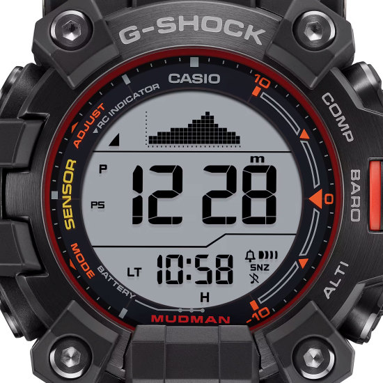극한 환경에서 활동을 지원하는 G-SHOCK MASTER OF G 시리즈로터프니스를 상징하는 블랙 바디에 선명한 이머전시 컬러를 더해,
