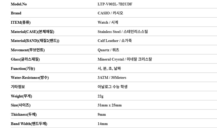 카시오 CASIO LTP-V002L-7B2UDF 여성 시계