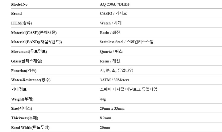 카시오 AQ-230A-7DHDF 공용 시계