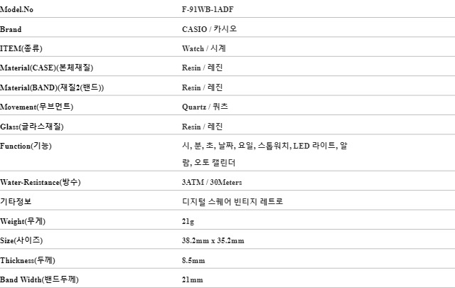 카시오 F-91WB-1ADF 공용 시계