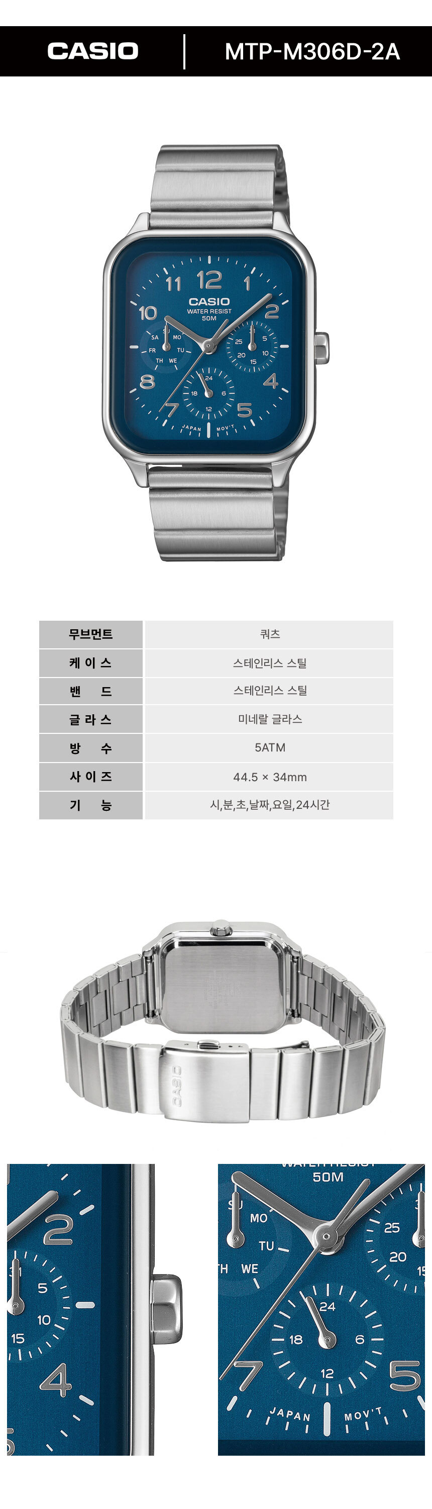 카시오 메탈 손목 시계 스퀘어 멀티펑션 MTP-M306D-2A
