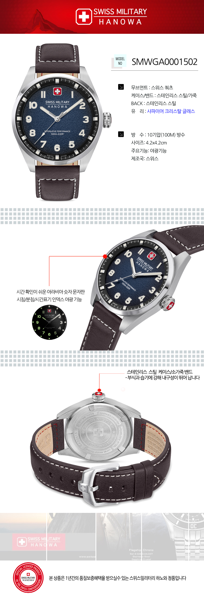 스위스밀리터리 하노와 100M 방수 사파이어 글라스 남성 손목시계 SMWGA0001502 SWISS MADE