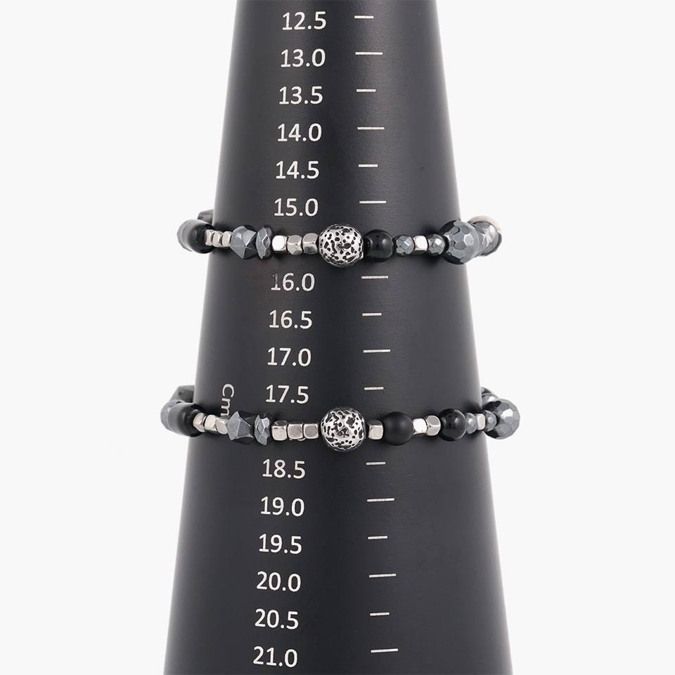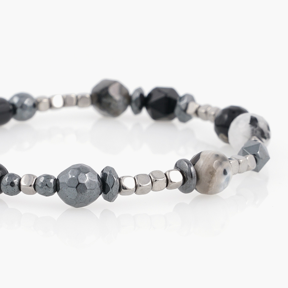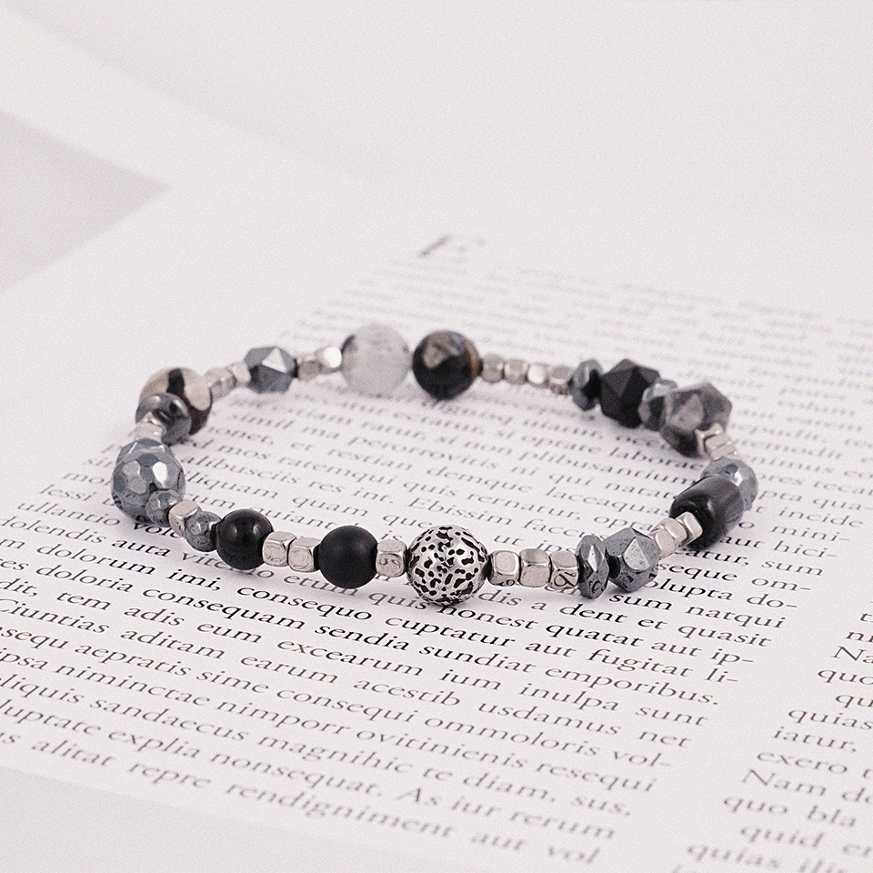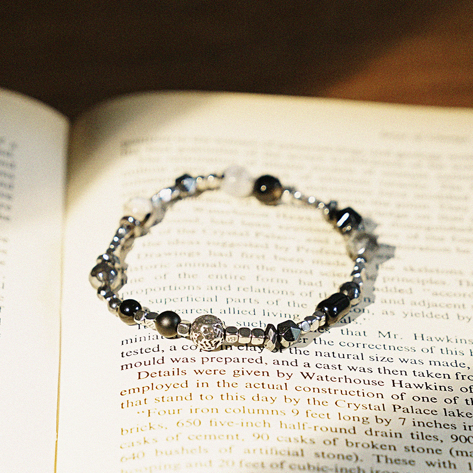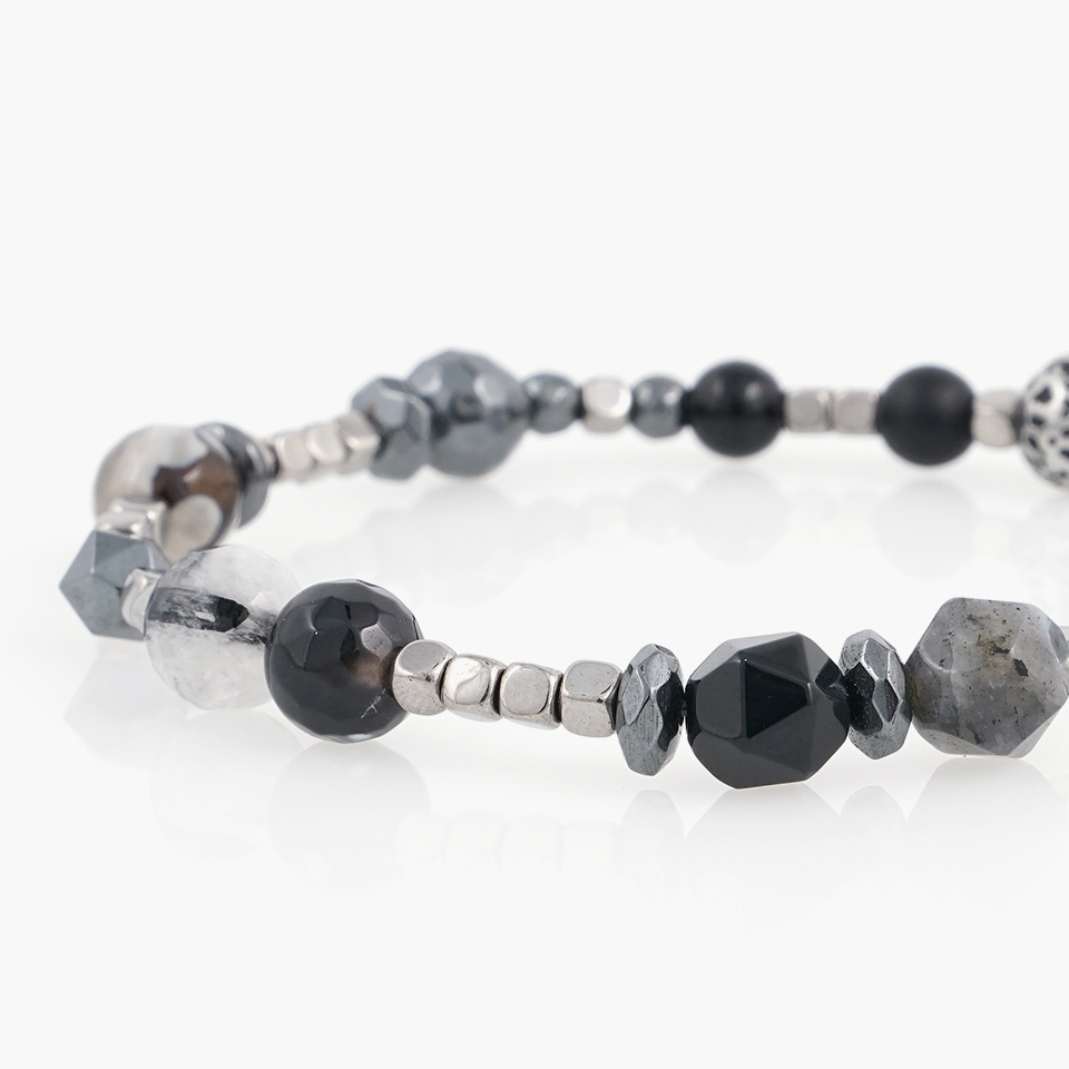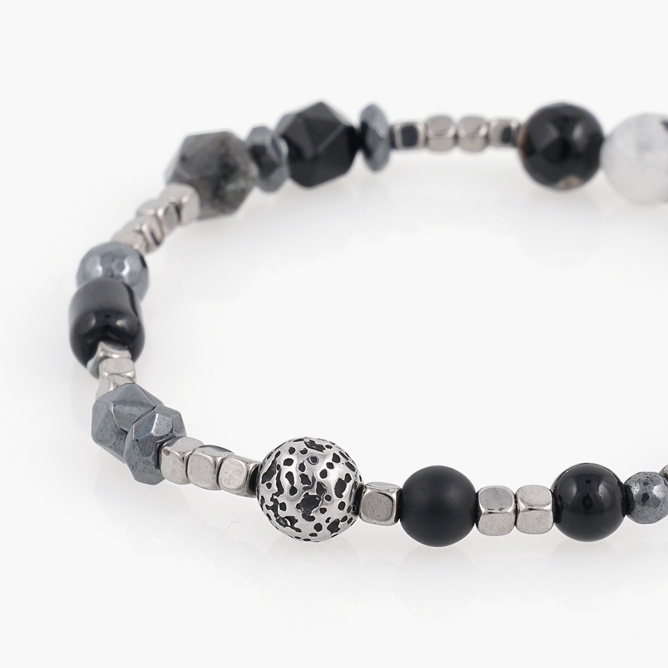 사이즈, 형태, 소재가 각기 다른 소재가 잘 어우러지도록 디자인 되어 유니크한 느낌의 매력적인 팔찌가 되었습니다.
