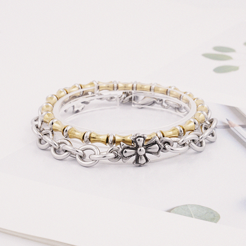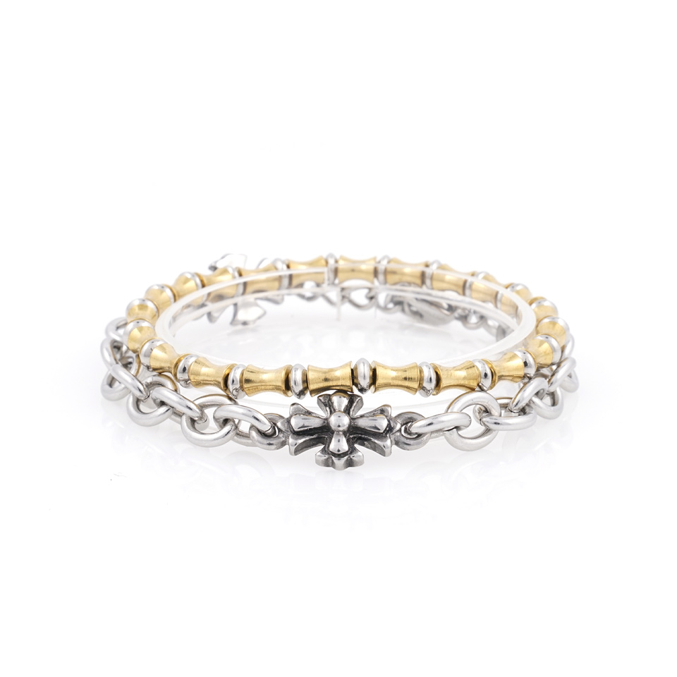 Product info Comment 깔끔한 실버톤 체인과 장식을 이용해 제작된 써지컬스틸 체인팔찌와 브라스와 써지컬스틸로 제작된 장식을 믹스해서 만든 팔찌의 세트구성입니다.