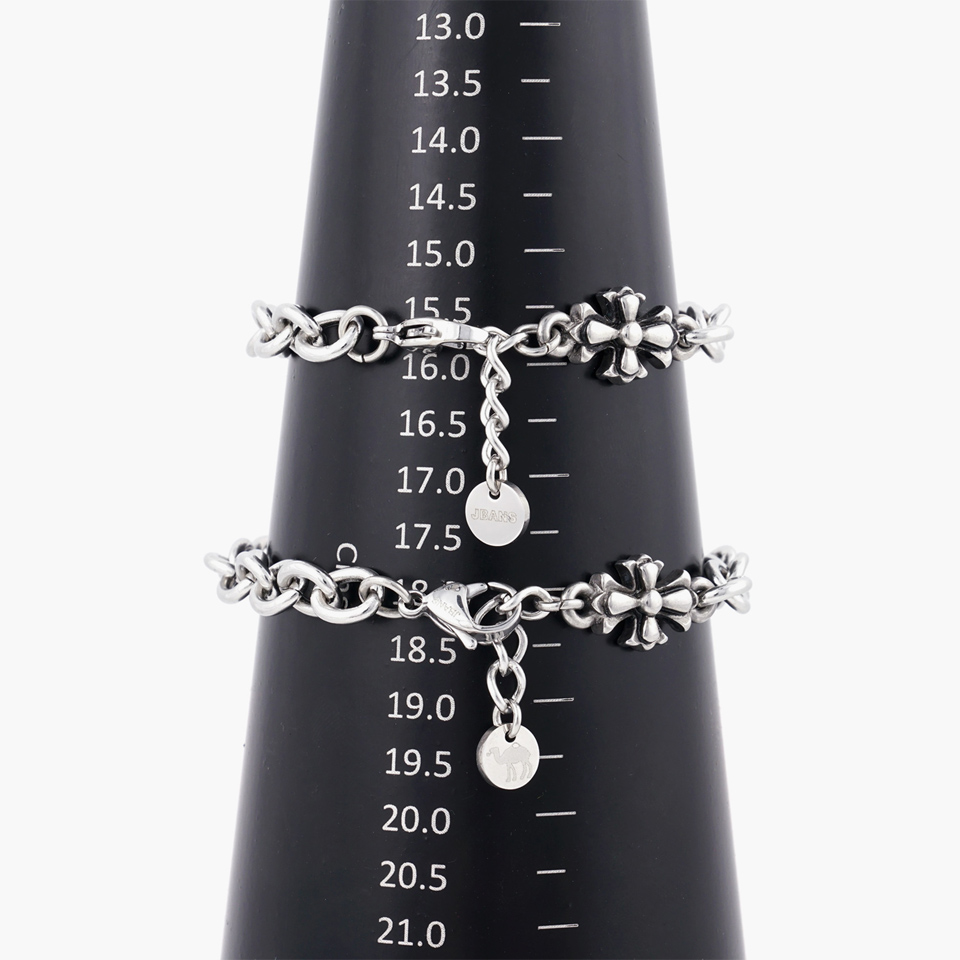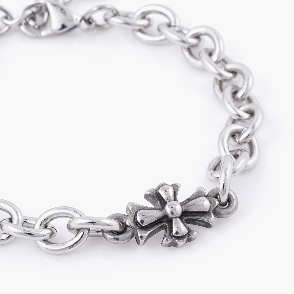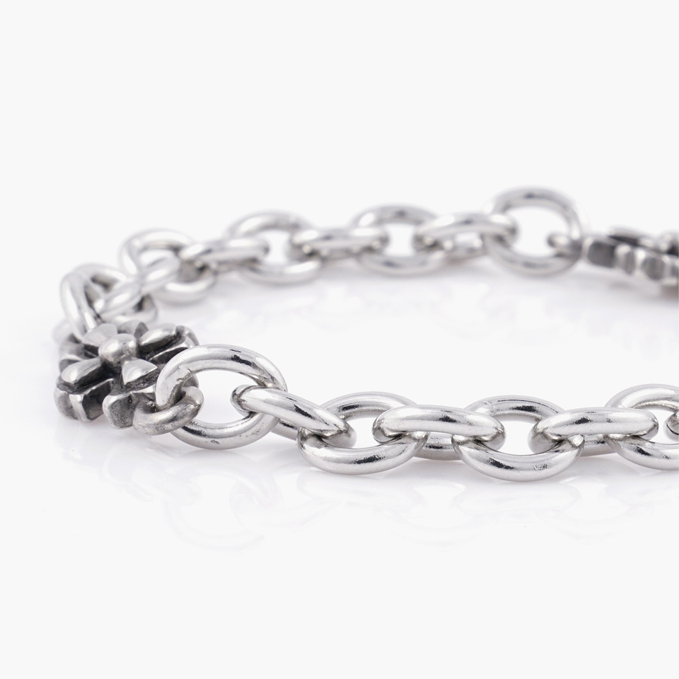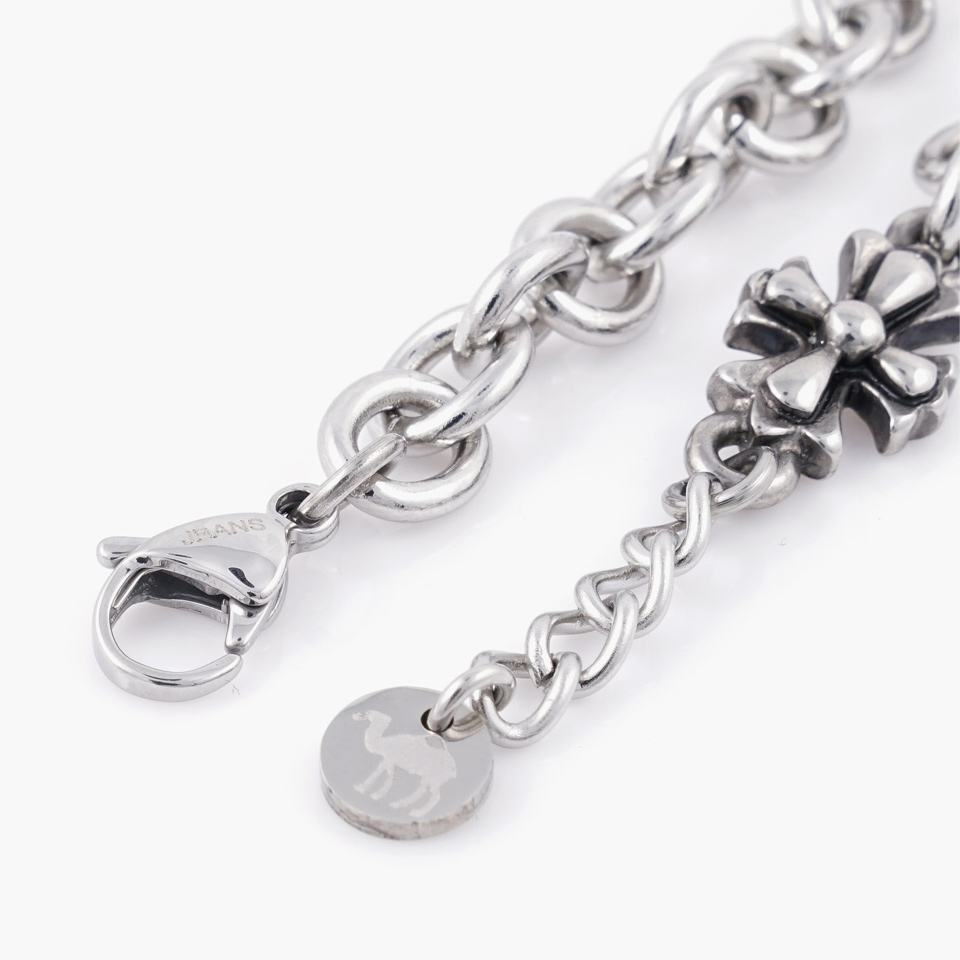 체인팔찌는 8mm의 볼드한 굵기의 링체인과 앤틱가공된 십자가 장식을 믹스해서 유니크한 느낌의 팔찌로 디자인되었습니다.