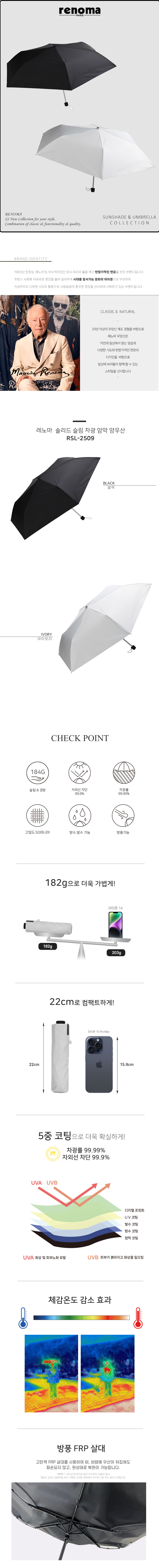 솔리드 슬림 자외선차단 / 차광율 99.9% 암막 3단 수동 양우산 (우산 겸 양산) RSL-2509
