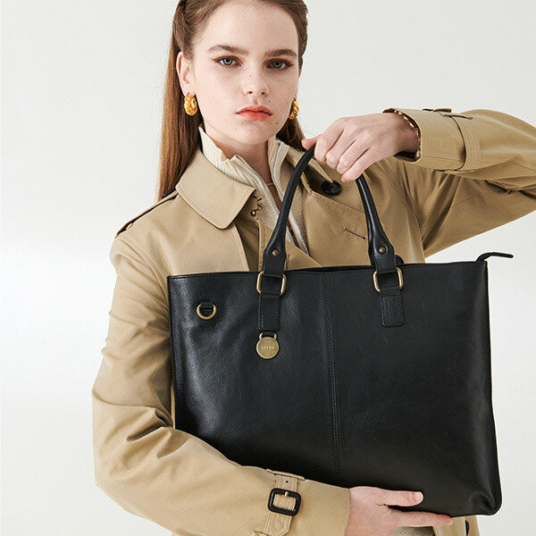 < 토트/크로스 2WAY 연출이 가능한 남녀노소 추천하는 넉넉한 사이즈의 서류가방 >부드러운 터치감에 내추럴한 느낌이 돋보이는 가죽을 사용하였고, 엔틱 청동 도금 장식이 멋스러움을 더해 클래식한 무드가 돋보이는 가방입니다.정면의 동전 로고 장식과 중앙 절개 디자인으로 포인트를 주었고,옆면과 바닥의 경계가 없어 깔끔하고 캐주얼한 디자인의 제품입니다.A4와 태블릿이 넉넉히 들어가는 사이즈에 지퍼클로징으로 안전한 수납이가능하며,자주 사용하는 카드나 휴대폰 등의 소지품은 후면 지퍼포켓에 수납할 수 있습니다.서류가방으로 착용가능하면서도 가죽과 장식에서 느껴지는 무드로 포멀한 착장 뿐만 아니라 캐주얼한 착장까지 모두 소화가능한 디자인으로 남녀노소 불문하고,직장인들과 학생들에게 추천합니다.*베지터블 가죽의 경우 소재 특성상 가죽의 원래 모습이 보존되어 있고 조직이 치밀하고 밀도가 높아 질기고 튼튼하지만, 표면 코팅을 하지 않아 손톱에도 스크래치가 나기 쉬우니 주의 부탁드립니다.**베지터블 가죽은 시간이 지남에 따라 에이징되어 더욱 멋스러운 소재입니다.***베지터블 가죽은 가죽의 원래 모습이 보존되어 있기 때문에 가죽의 주름이나 벌레물린 자국 등이 있을 수 있습니다.