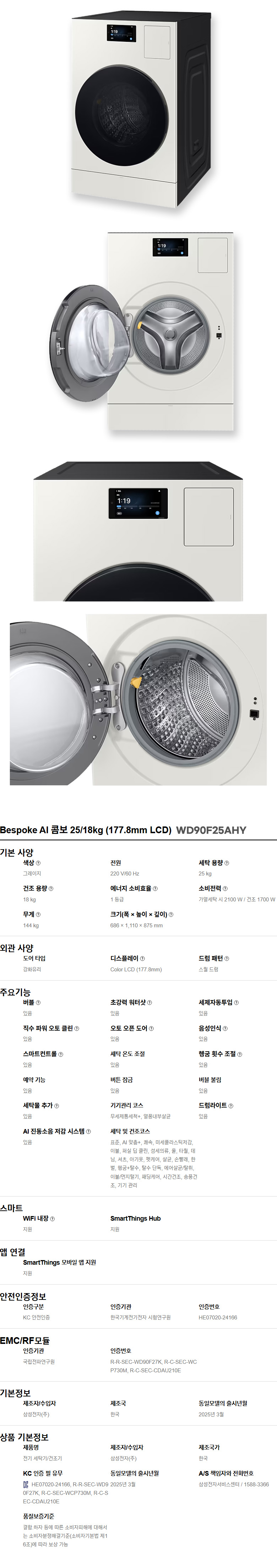 삼성 WD90F25AHY 25년형 AI콤보 올인원 세탁 25kg 건조 18kg 그레이지