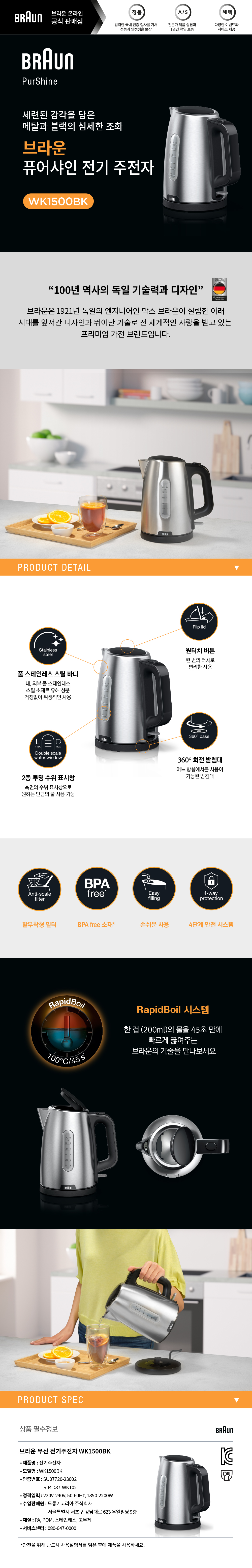 퓨어샤인 전기 주전자 WK1500BK 원터치/360도회전받침대/2종 투명수위표시창
