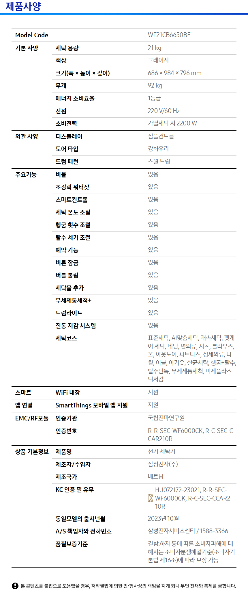 삼성전자 그랑데 드럼세탁기 WF21CB6650BE 물류배송