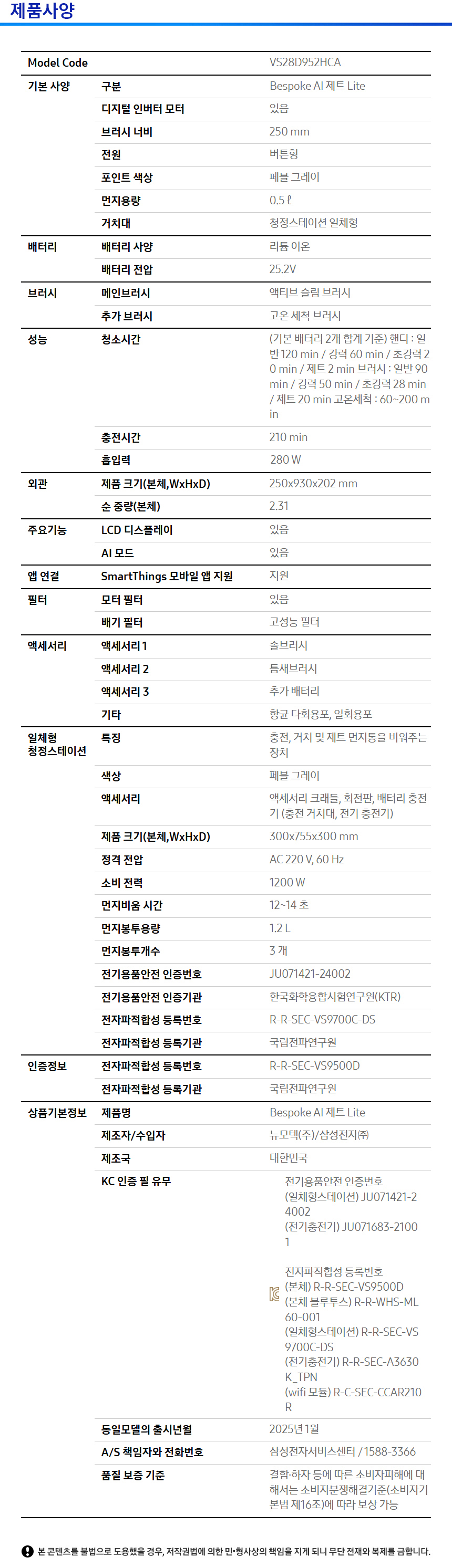 삼성 비스포크 제트 AI Lite 청소기 280W VS28D952HCA