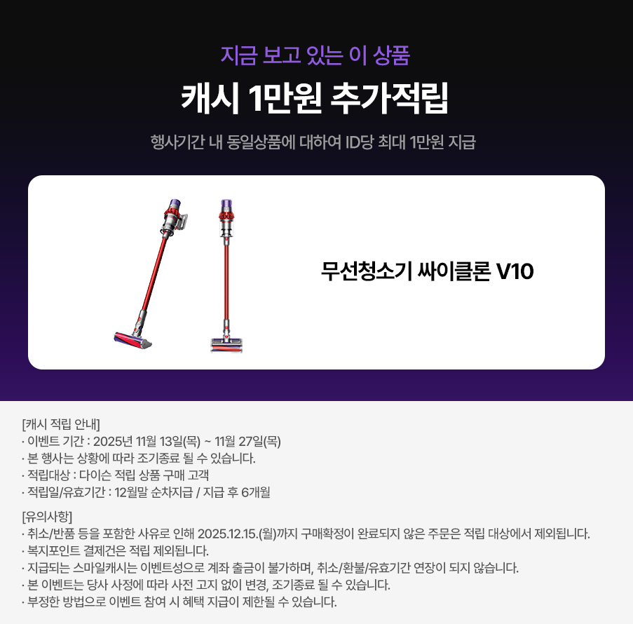 한정수량 35.9만+1만 캐시적립) 다이슨 무선청소기 싸이클론 V10