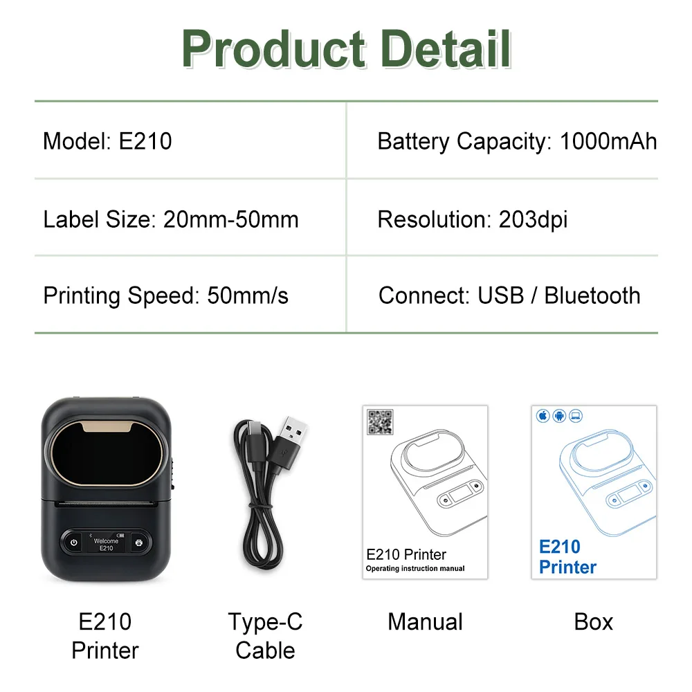 Labelwell-E210 휴대용 무선 블루투스 감열 라벨 스티커 프린터, E210, DIY, 자체 접착, 테이프, 잉크 없음홈 오피스 빠른 인쇄