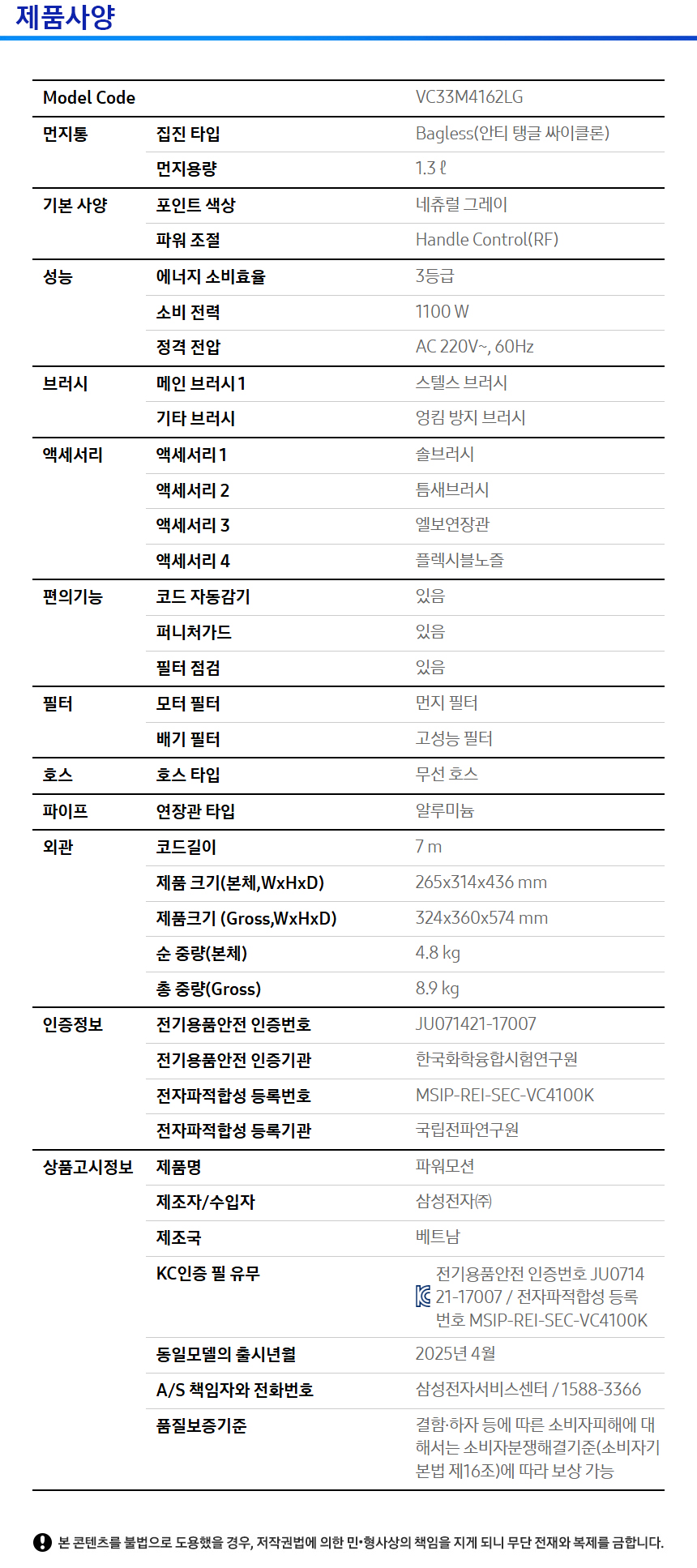 삼성 파워모션 4100 청소기 VC33M4162LG 네츄럴그레이 엉킴방지브러시