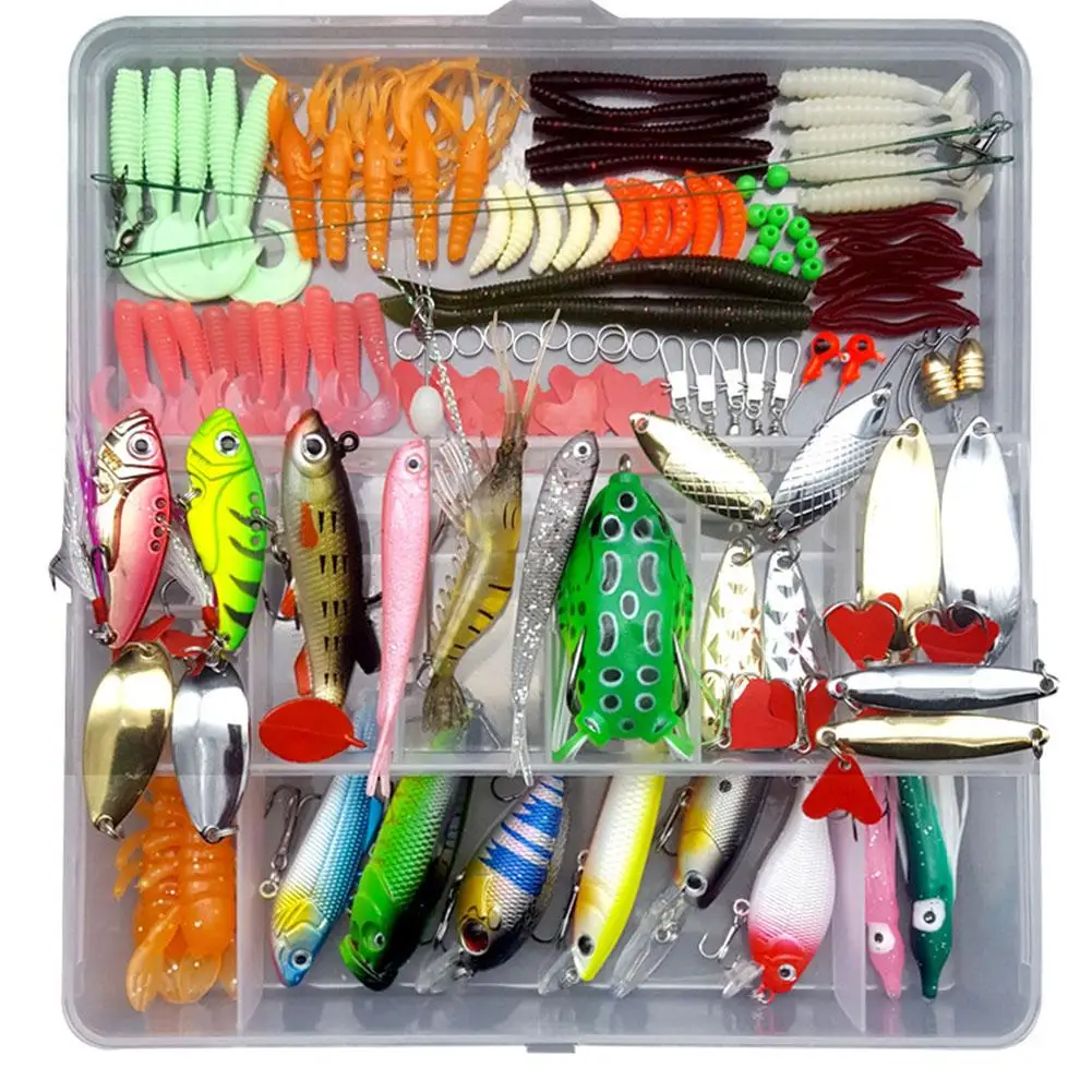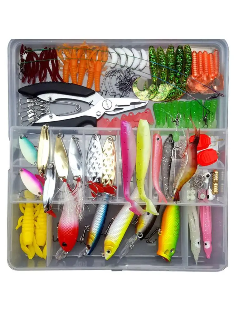 122 개 제품 목록: 금속 장식 조각 * 12, 단단한 미끼 * 6, 부드러운 미끼 * 60, 액세서리 * 44, 미끼 상자 * 1; 미끼 상자 28.5*18*6cm.