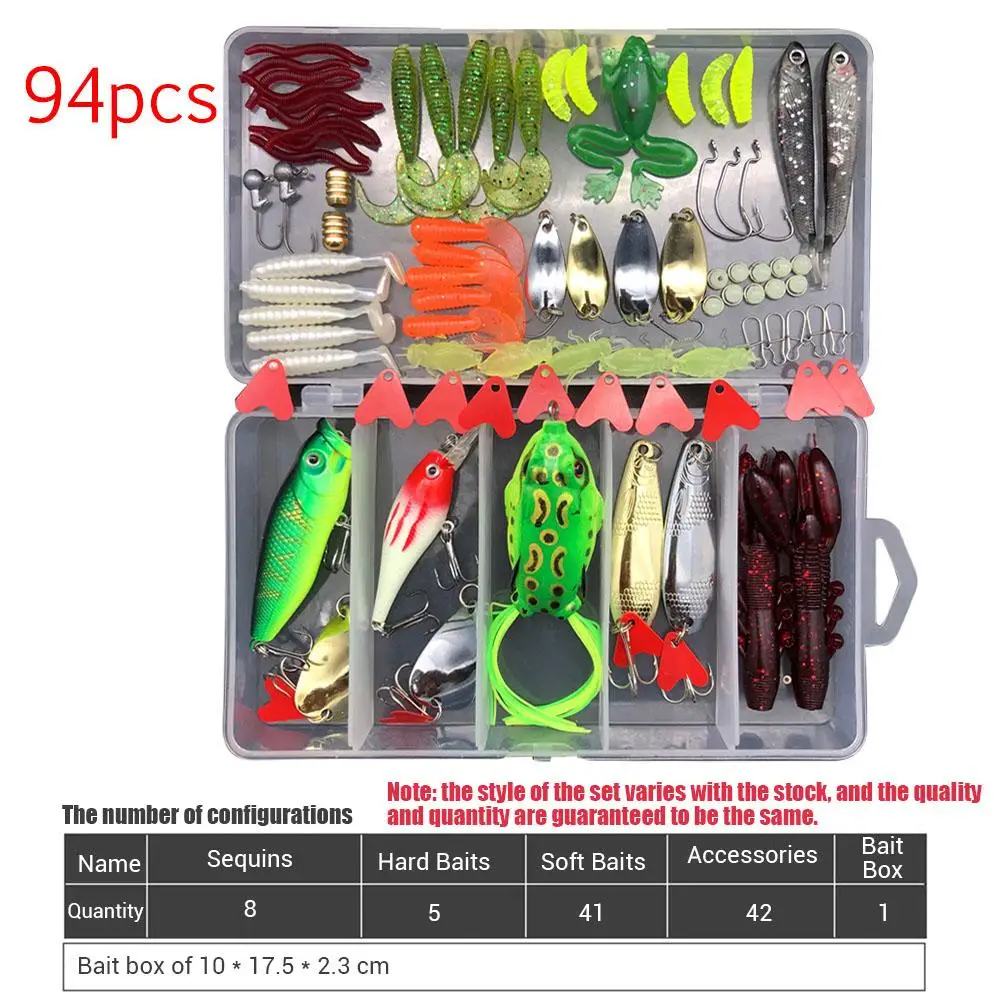 94 개 제품 목록: 금속 장식 조각 * 8, 단단한 미끼 * 2, 부드러운 미끼 * 41, 액세서리 * 42, 미끼 상자 * 1; 미끼 상자: 17*8.3*3cm.