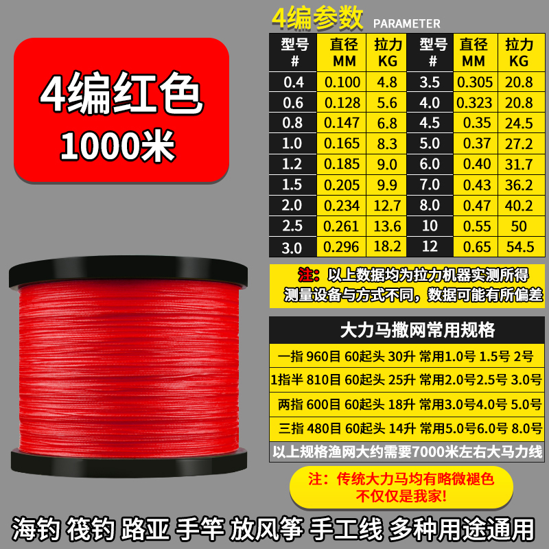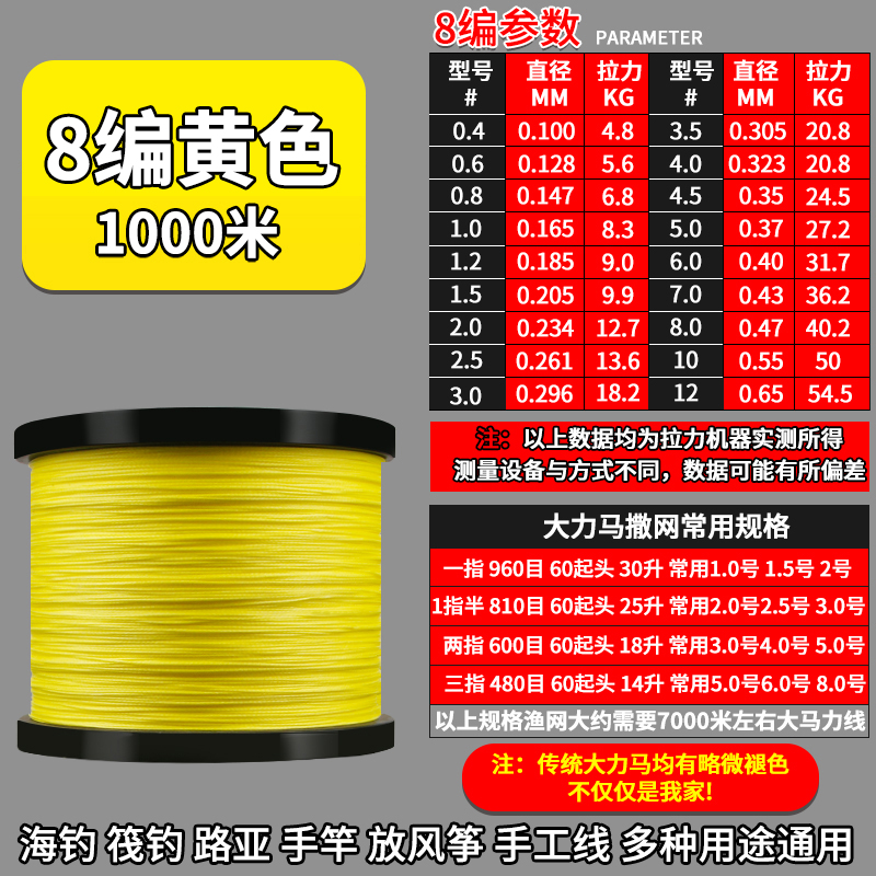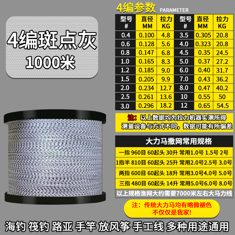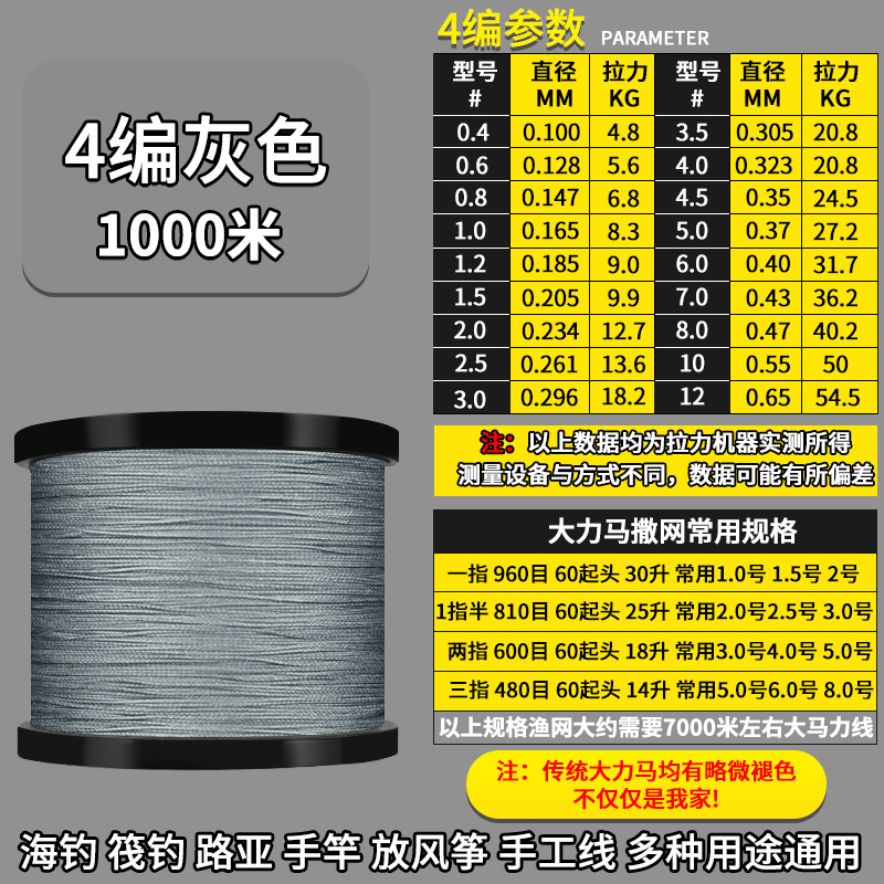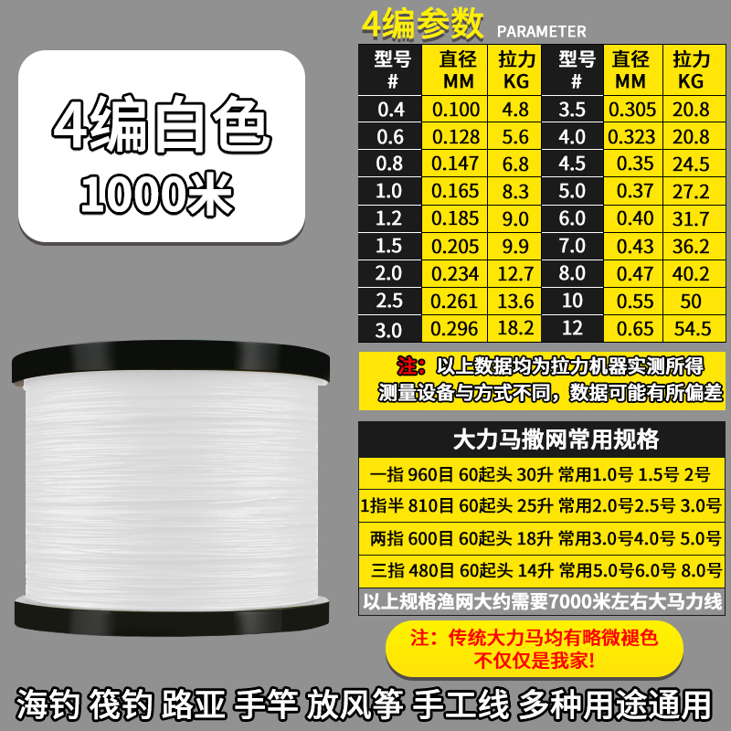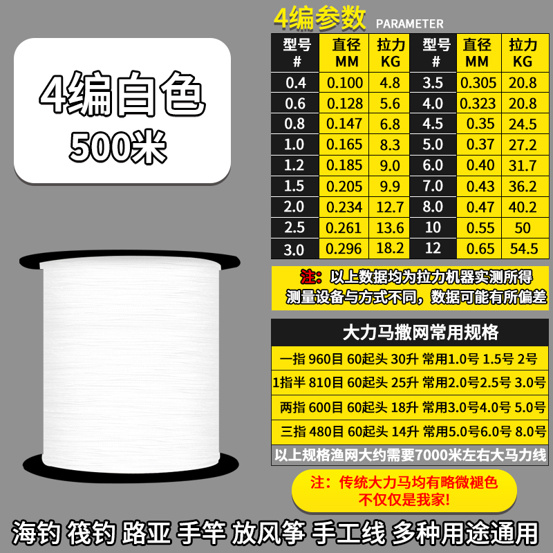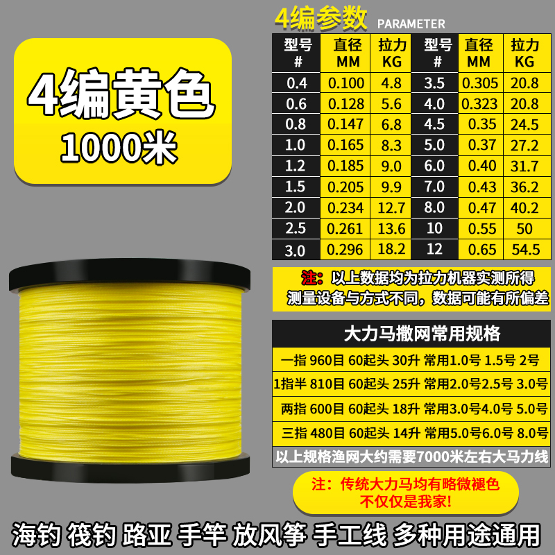| 낚싯줄 번호 | 0.2번, 0.4번, 0.6번, 0.8번, 1번, 1.2번, 1.5번, 2번, 2.5번, 3번, 3.5번, 4번, 4.5번, 5번, 6번, 7번, 8번, 10번, 12번 |