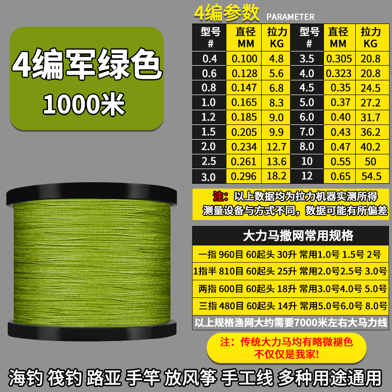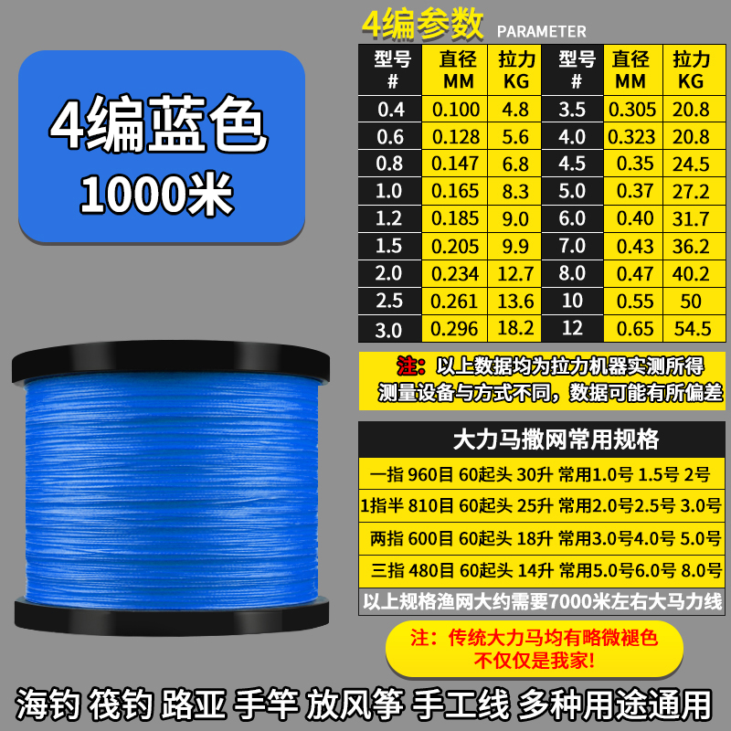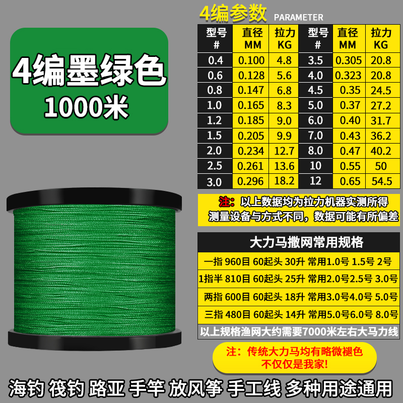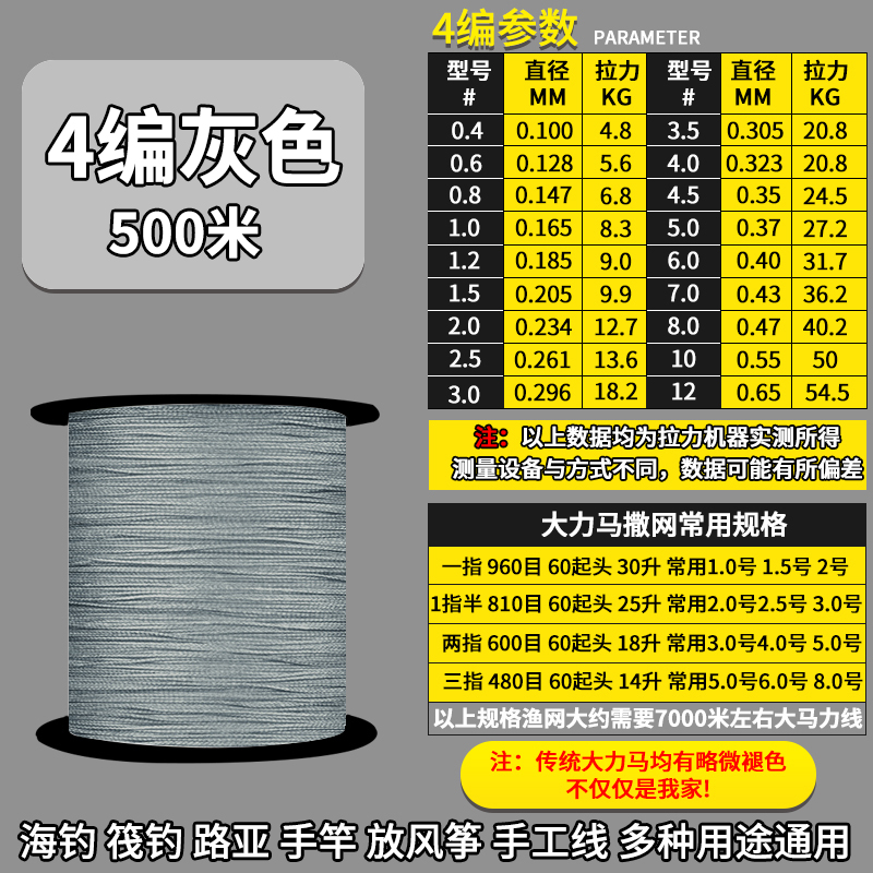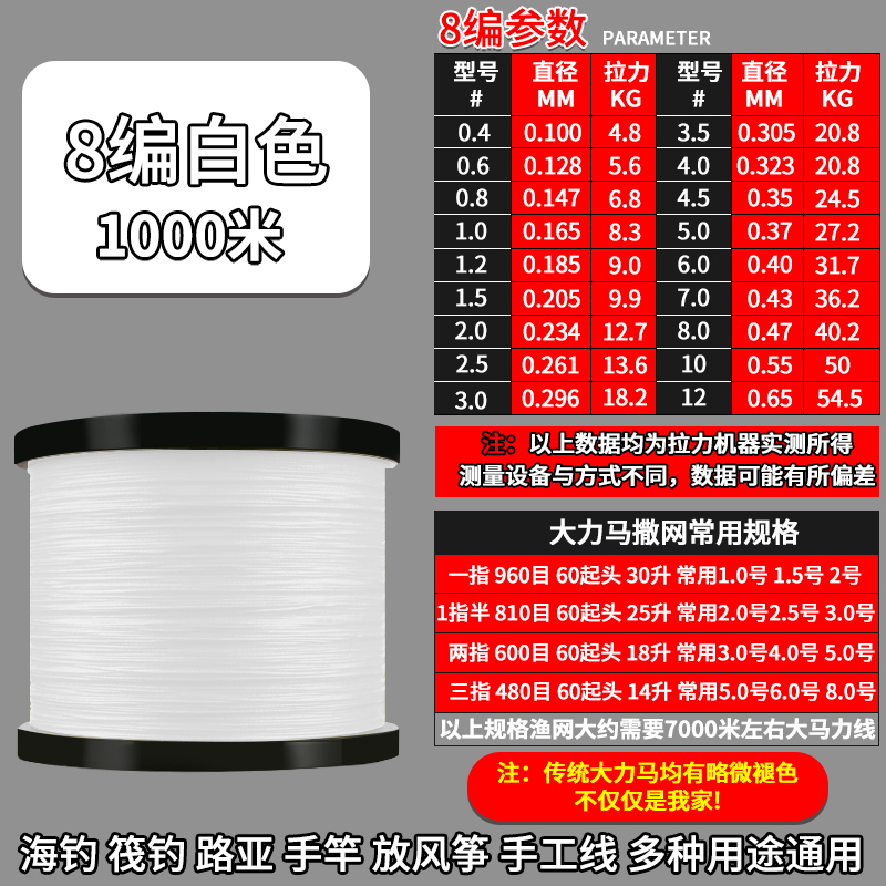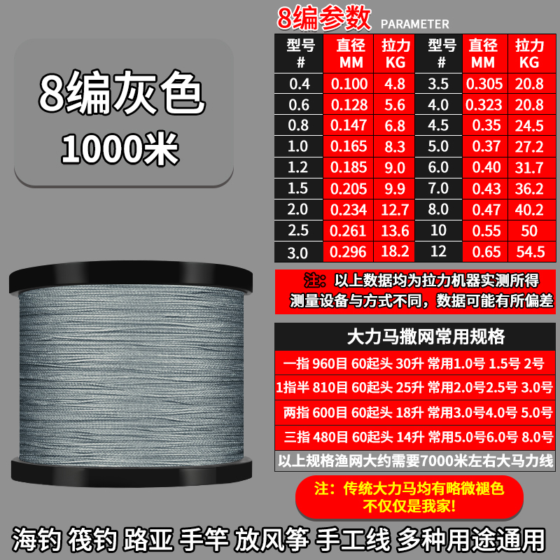 | 낚싯줄 번호 | 0.2번, 0.4번, 0.6번, 0.8번, 1번, 1.2번, 1.5번, 2번, 2.5번, 3번, 3.5번, 4번, 4.5번, 5번, 6번, 7번, 8번, 10번, 12번 |