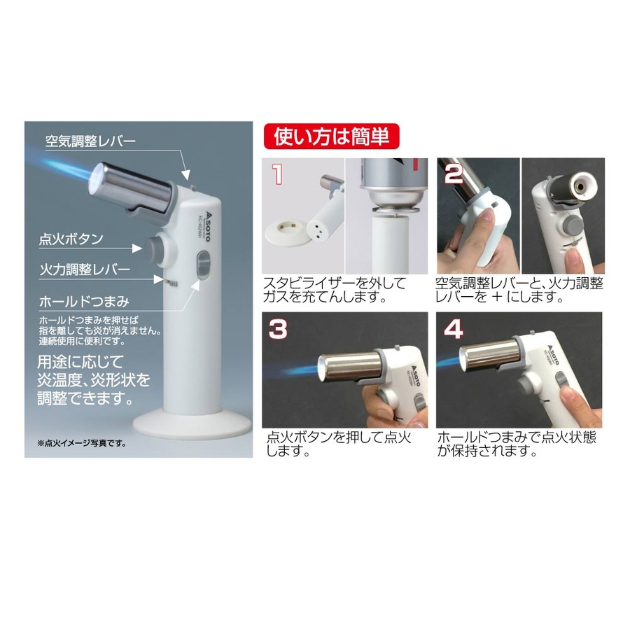 점화 버튼을 누르면 점화, 놓으면 소화되는 원터치 조작 방식입니다.