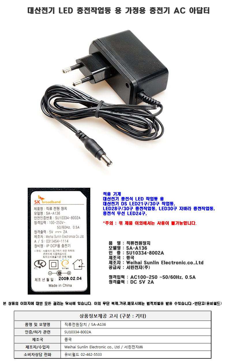 전원 아답터/대산전기 LED 충전 작업등/충전식 용