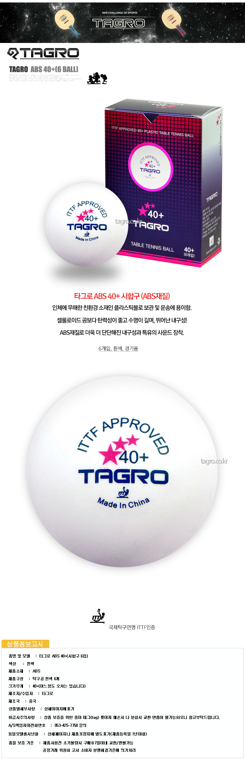 타그로 6입탁구공 탁구시합구 경기용탁구공 ITTF공인